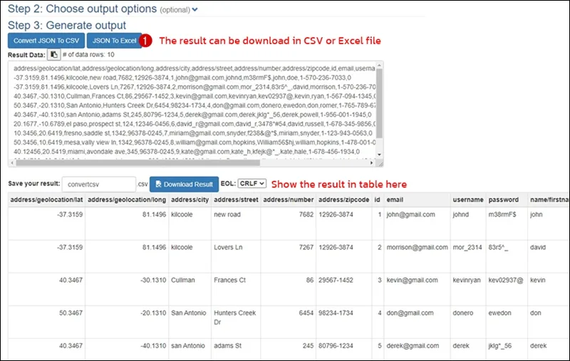- At Step3, choose JSON to Excel or Convert JSON to CSV as you want. It will let you download the file to your computer. Also, it shows the result in the table to let check before downloading the file.