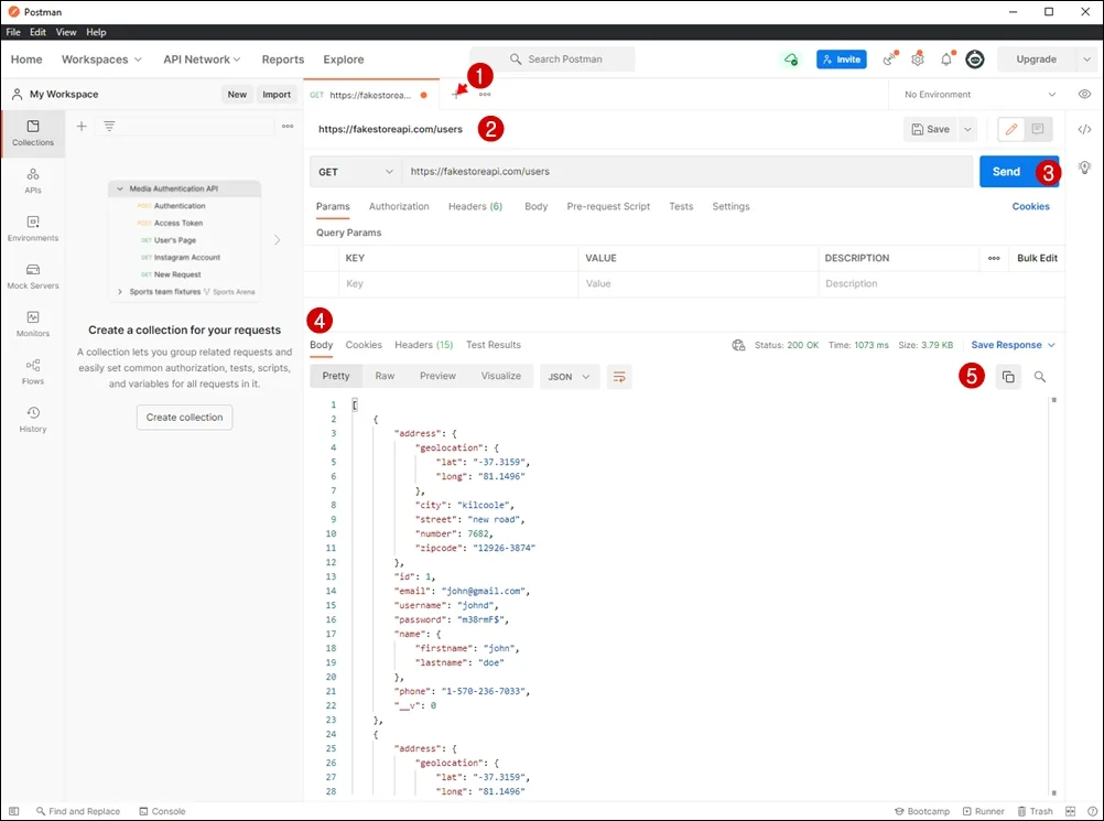 - At the GET method which is a default method, enter your API endpoint. In this tutorial, I use “https://fakestoreapi.com/users” which is the fake API. If you need to use POST, PUT or DELETE methods, you can change it. If you need to pass some parameters such as authenication, you can add via Query Params.