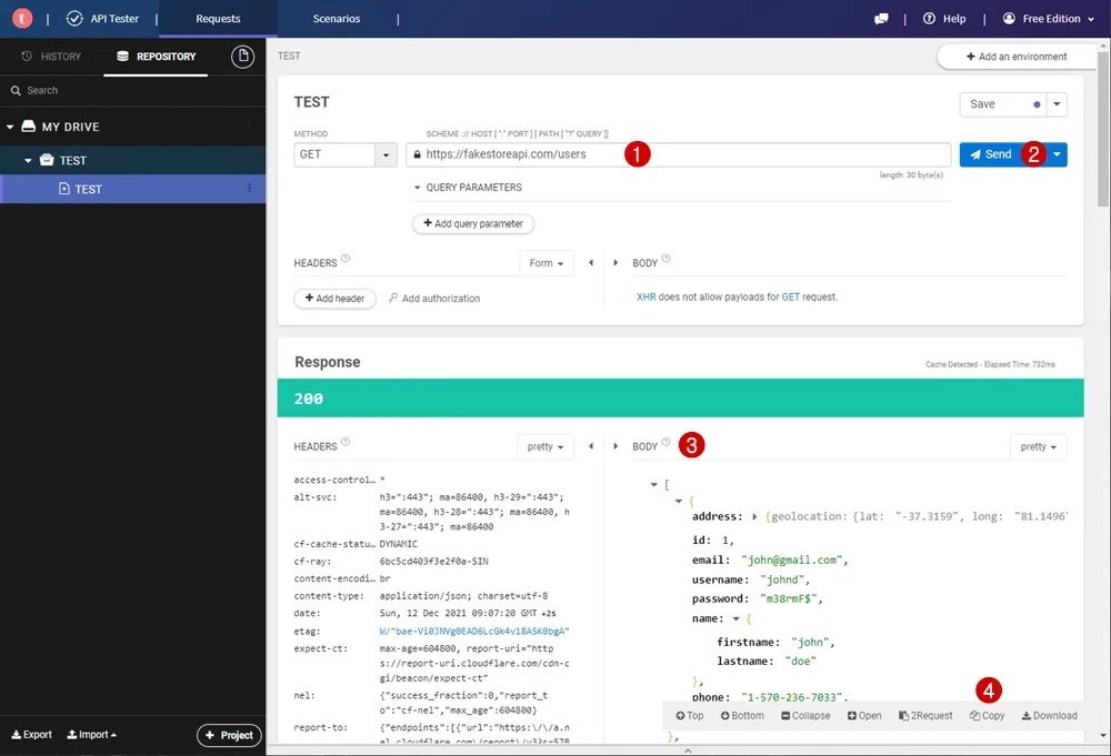 - At GET method which is a default method, enter your API endpoint. In this tutorial, I use “https://fakestoreapi.com/users” which is the fake API. If you need to use POST, PUT or DELETE methods, you can change it. If you need to pass some parameters such as authenication, you can add via Query Paramaters.